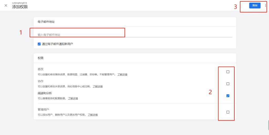 确定权限,在左上角输入你想授权的用户邮箱,并在下方权限栏勾选给他开放的权限,勾选后点击右上角添加,完成。